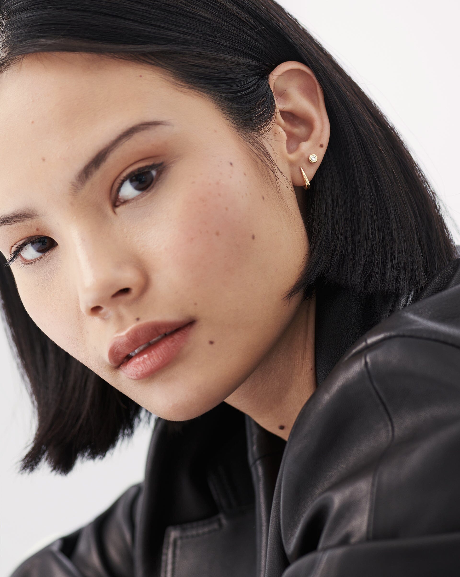 Mark your memories with these 14ct solid yellow gold stud earrings, elevated with a singular round cut white diamond in a recycled gold bezel setting. Team with huggies for a refined take on ear stacking.