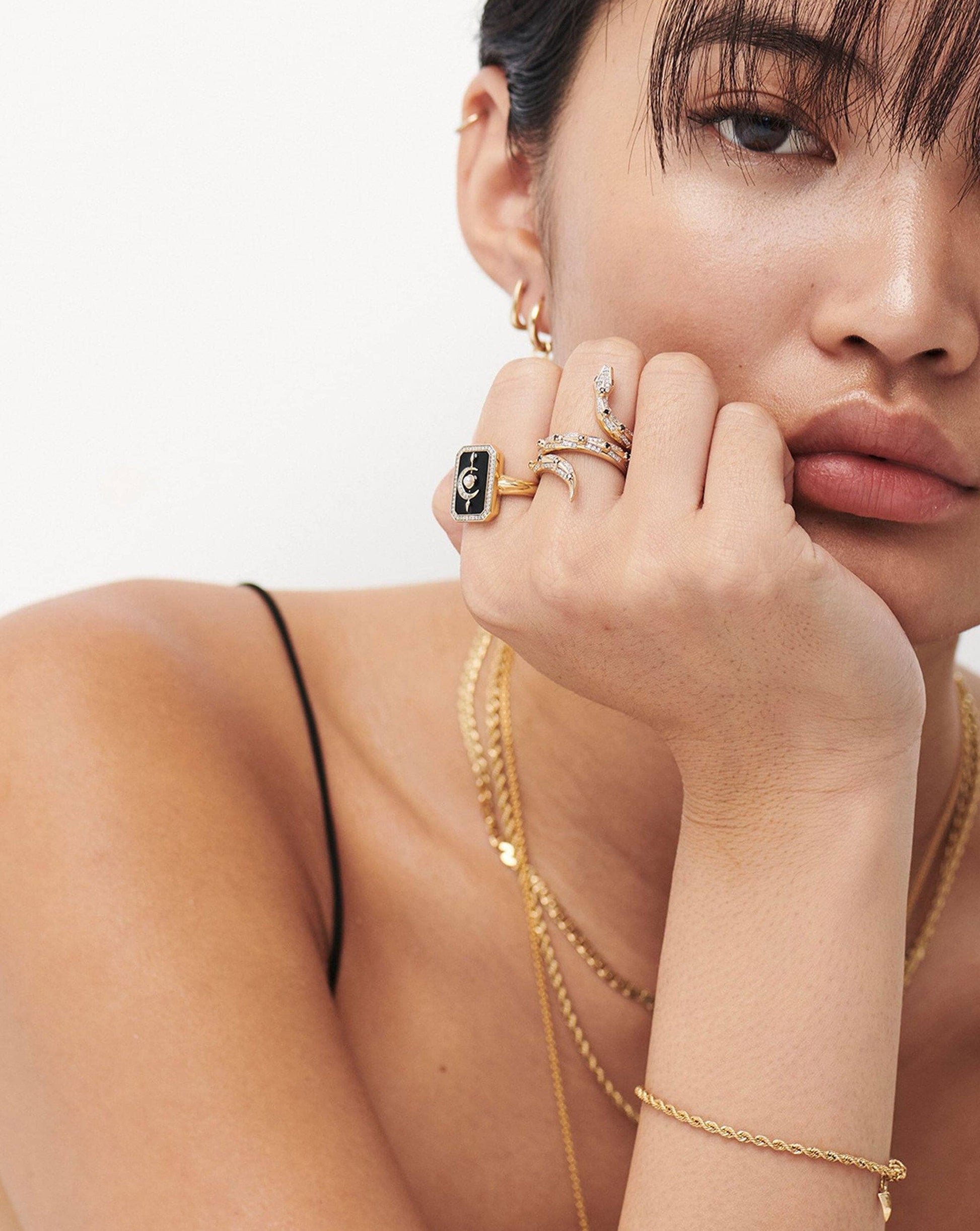 Shed your preconceptions with this opulent serpent ring designed to coil around the finger. Inspired by symbols of the old world, the scale detailing is embellished with white diamond pavé and inset black diamonds.
