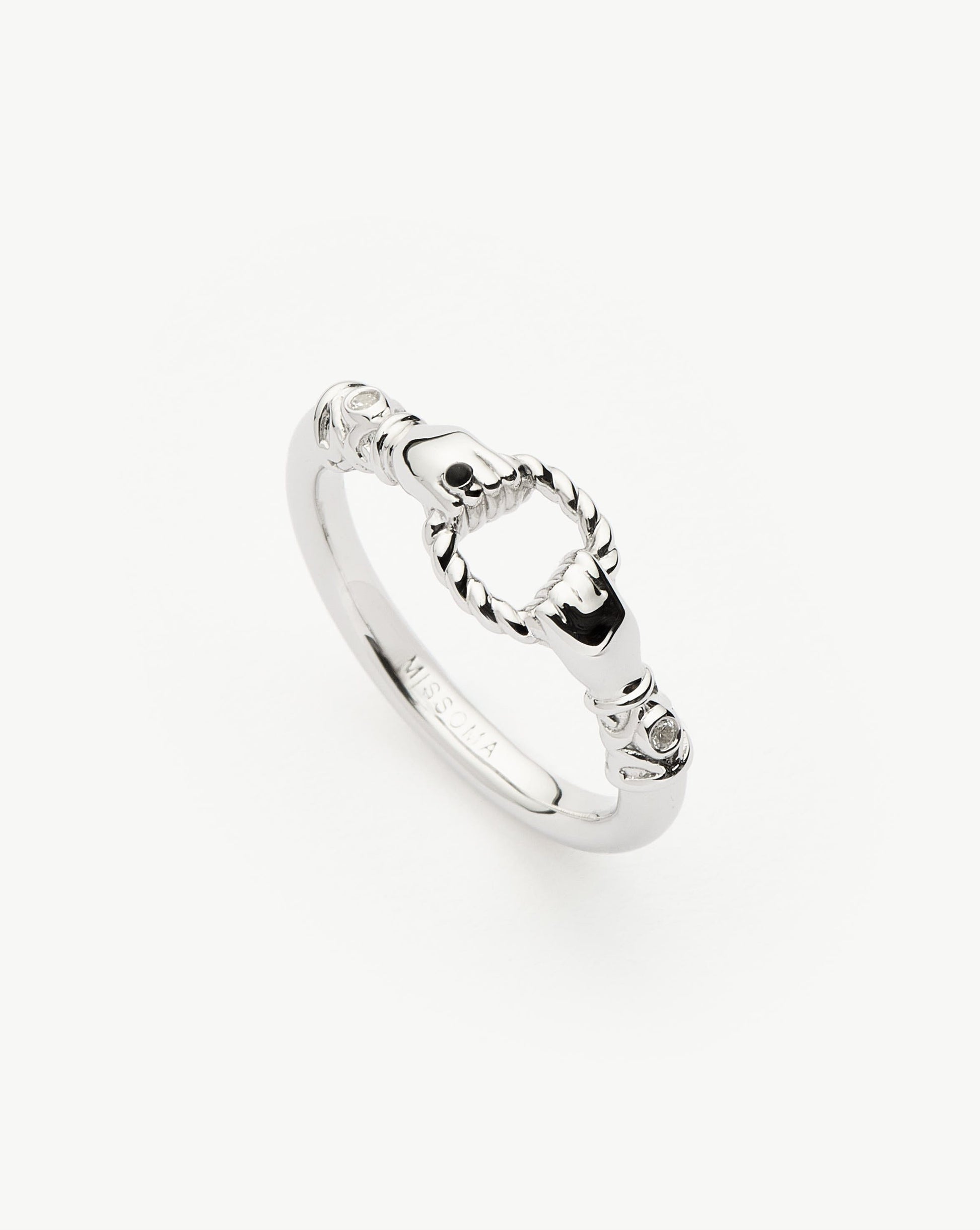 Inspired by our Harris Reed x Missoma sell out design, Georgian-inspired hands come together in our first-ever In Good Hands ring. Intricately detailed, each cuff has been illuminated with white cubic zirconia and features a ring with black enamel. Wear solo or style with other rings for an instant stack.