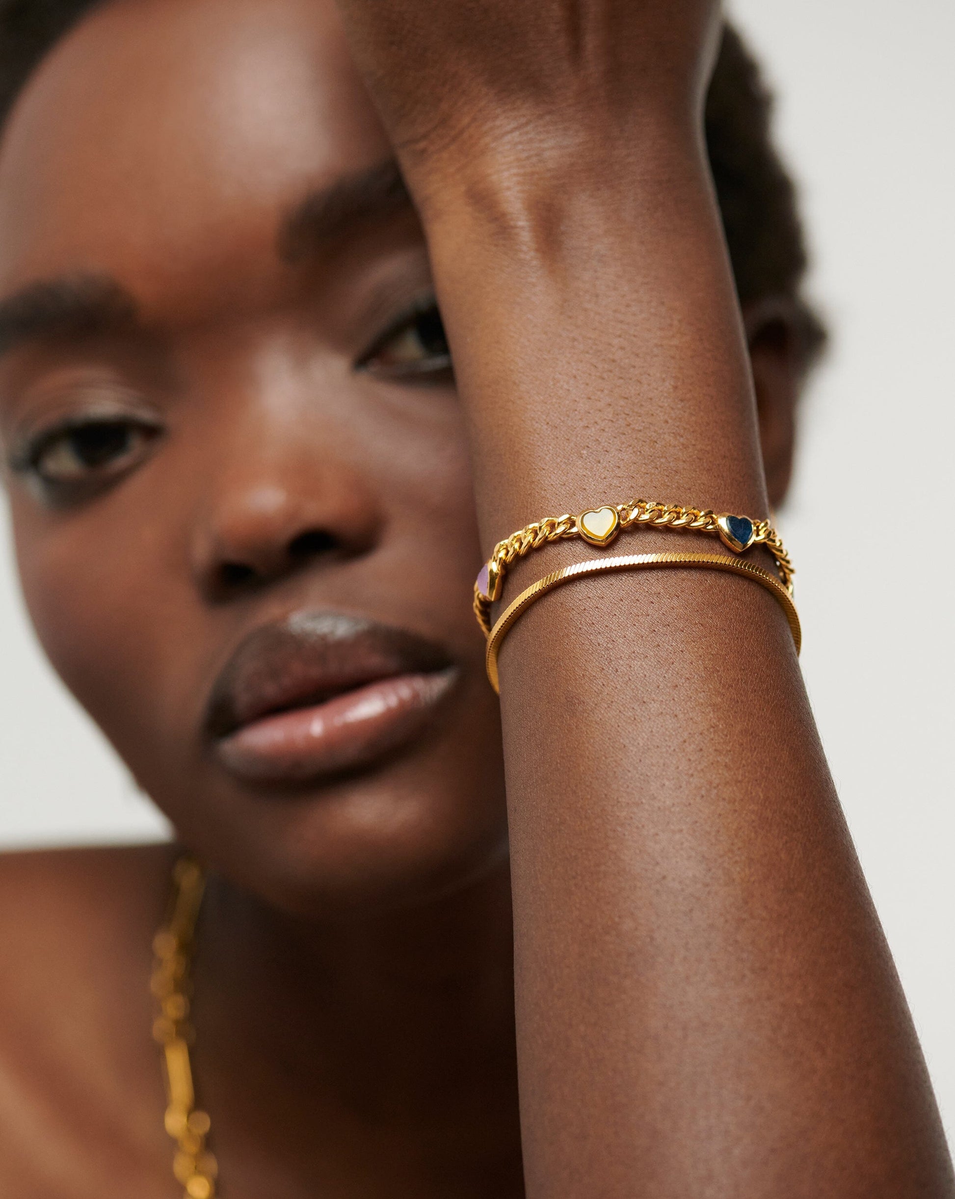 Bring colour to your arm stack. This retro-inspired bracelet features five jelly heart gemstone charms inset on a thick curb chain, in dyed mango and aqua chalcedony, blue, purple and pink quartz. Stack with other chains and beaded bracelets or wear solo for everyday styling. Also available in the necklace.
