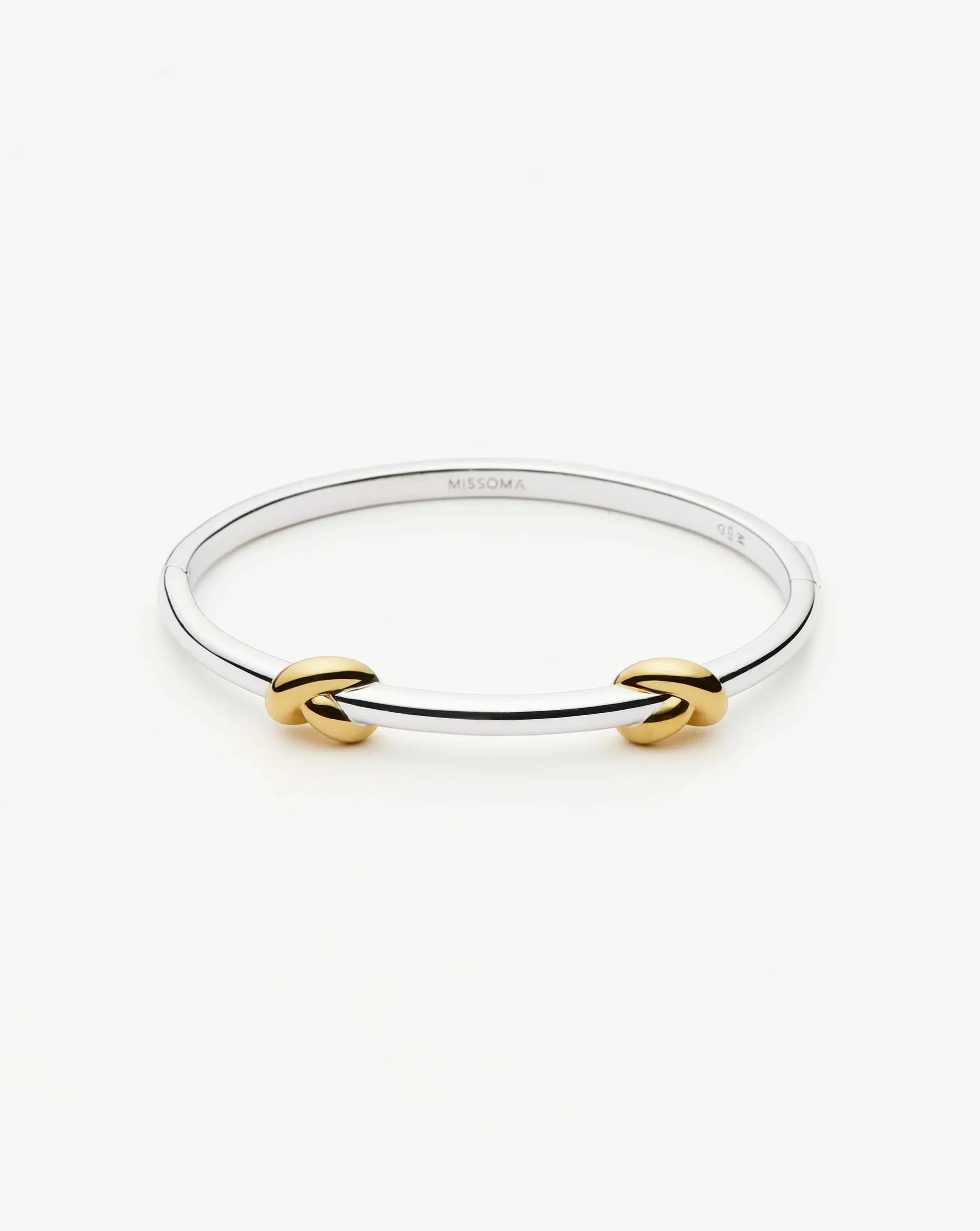 The ultimate mixed metal moment. This statement bracelet features eye-catching gold knots wrapped around a silver hinged bangle. Designed to be worn with the matching Lucy Williams Knot Torque Necklace or Knot Hoops.