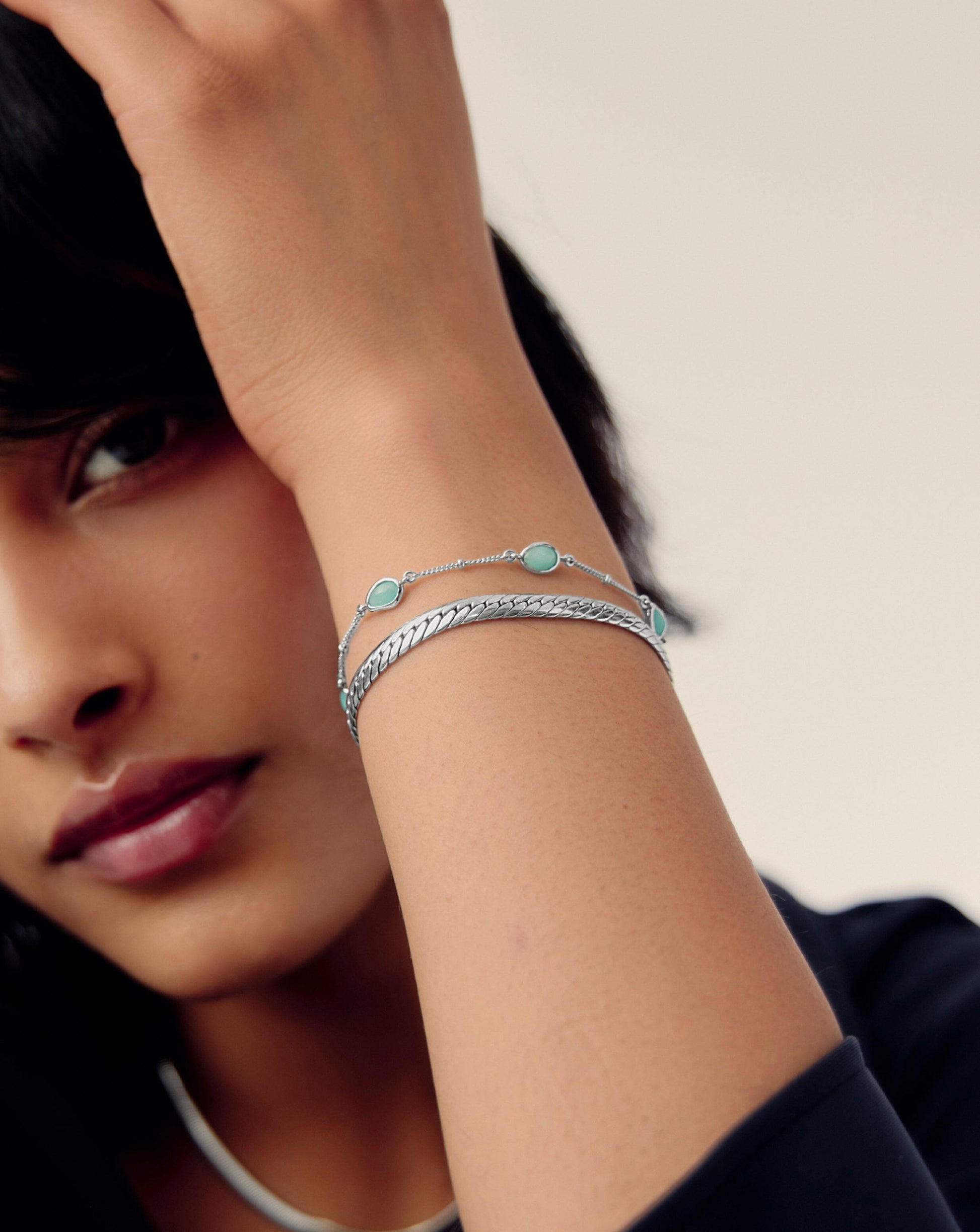 A meaningful gemstone symbolising peace, amazonite meets molten metals in this delicate gemstone charm bracelet. Team with other chains or beaded bracelets for more maximalist styling. Also available as a necklace.