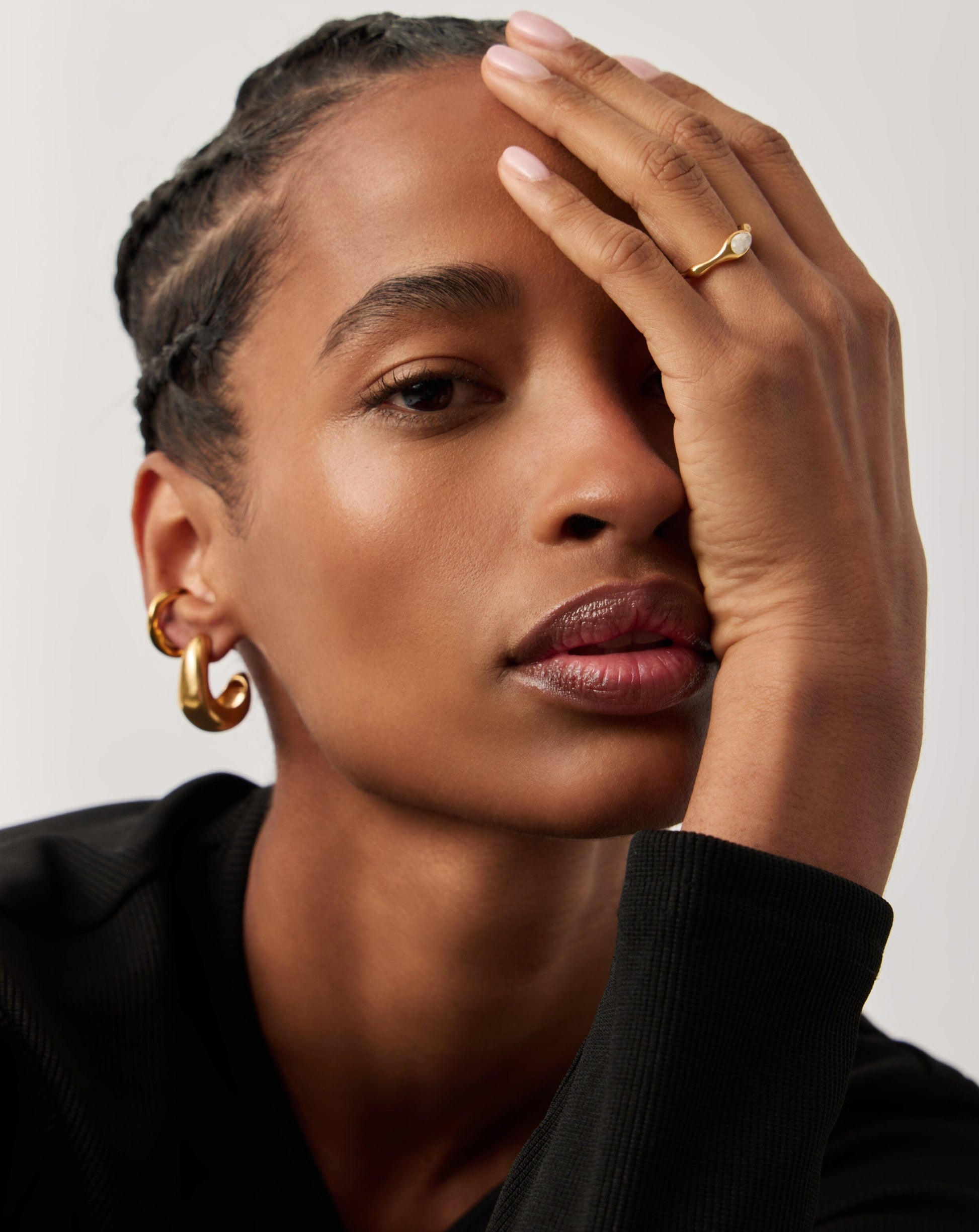 A symbol of new beginnings, rainbow moonstone meets molten in this delicate gemstone stacking ring. Stack with other rings for more maximalist styling. Also available as a cuff bracelet.
