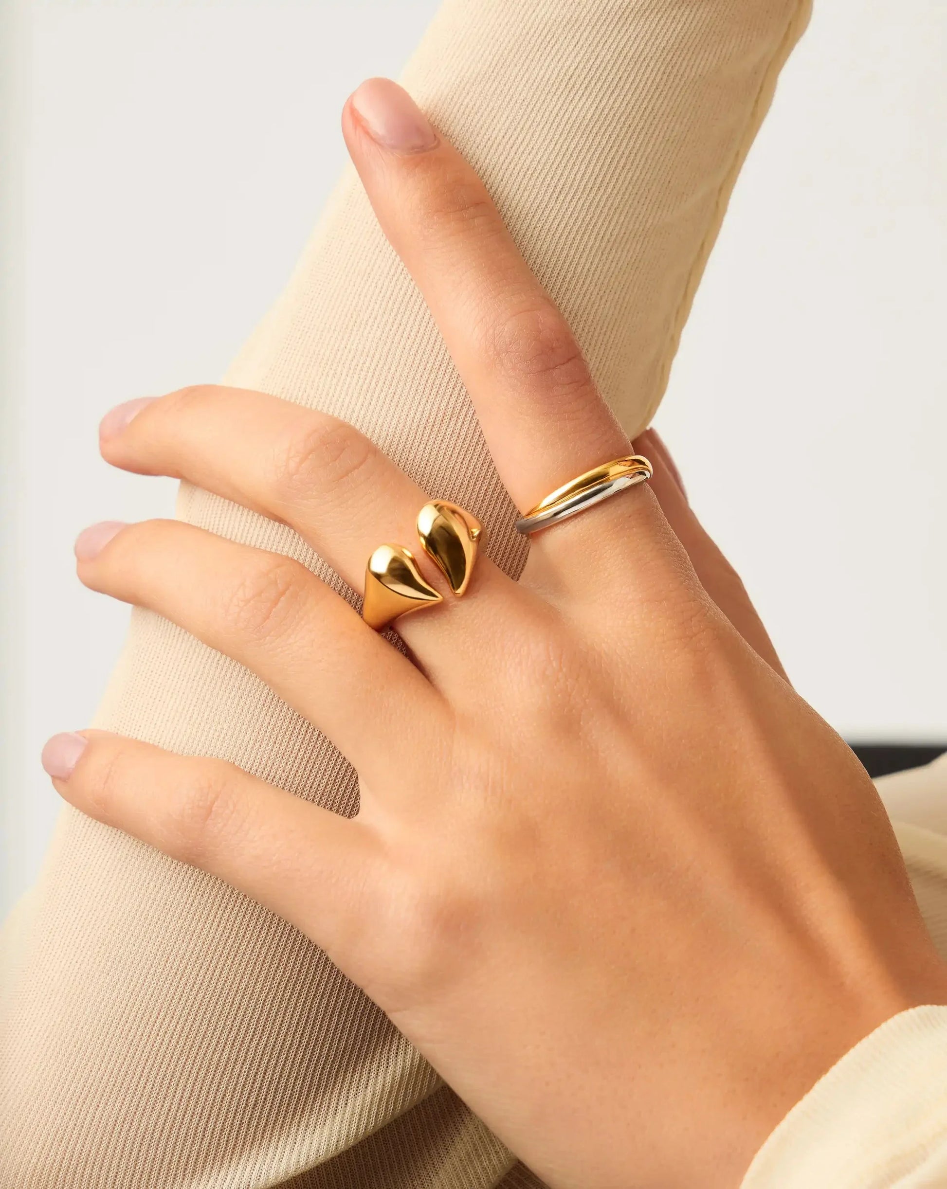 This Molten Heart Statement Ring features a liquid heart motif designed to feel weighty and comforting, inspired by the ergonomic feel of holding a smooth pebble in your palm. The sculptural open ring is designed to hug the finger. Wear solo or go bold and team with other pieces from the collection for maximum impact.
