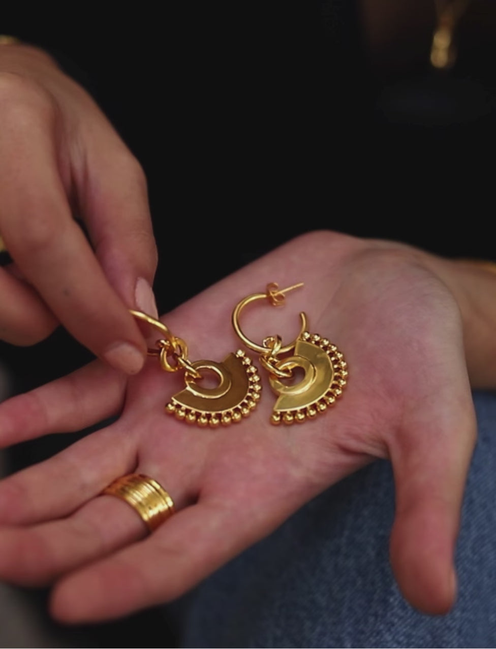 Everyday statement hoops inspired by Colombia. These unique best selling earrings feature bobble-trimmed charms suspended from delicate hoops in 18ct gold plating. Add to your ear stack with chunky gold huggies or pair with the Zenyu Fan Necklace. As seen in The White Lotus.